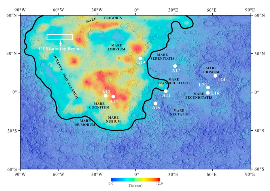 月球正面钍含量分布和嫦娥五号着陆区(白框),A代表阿波罗采样点,L代表月球号采样点,其中A12、14和15也位于风暴洋克里普地体范围内