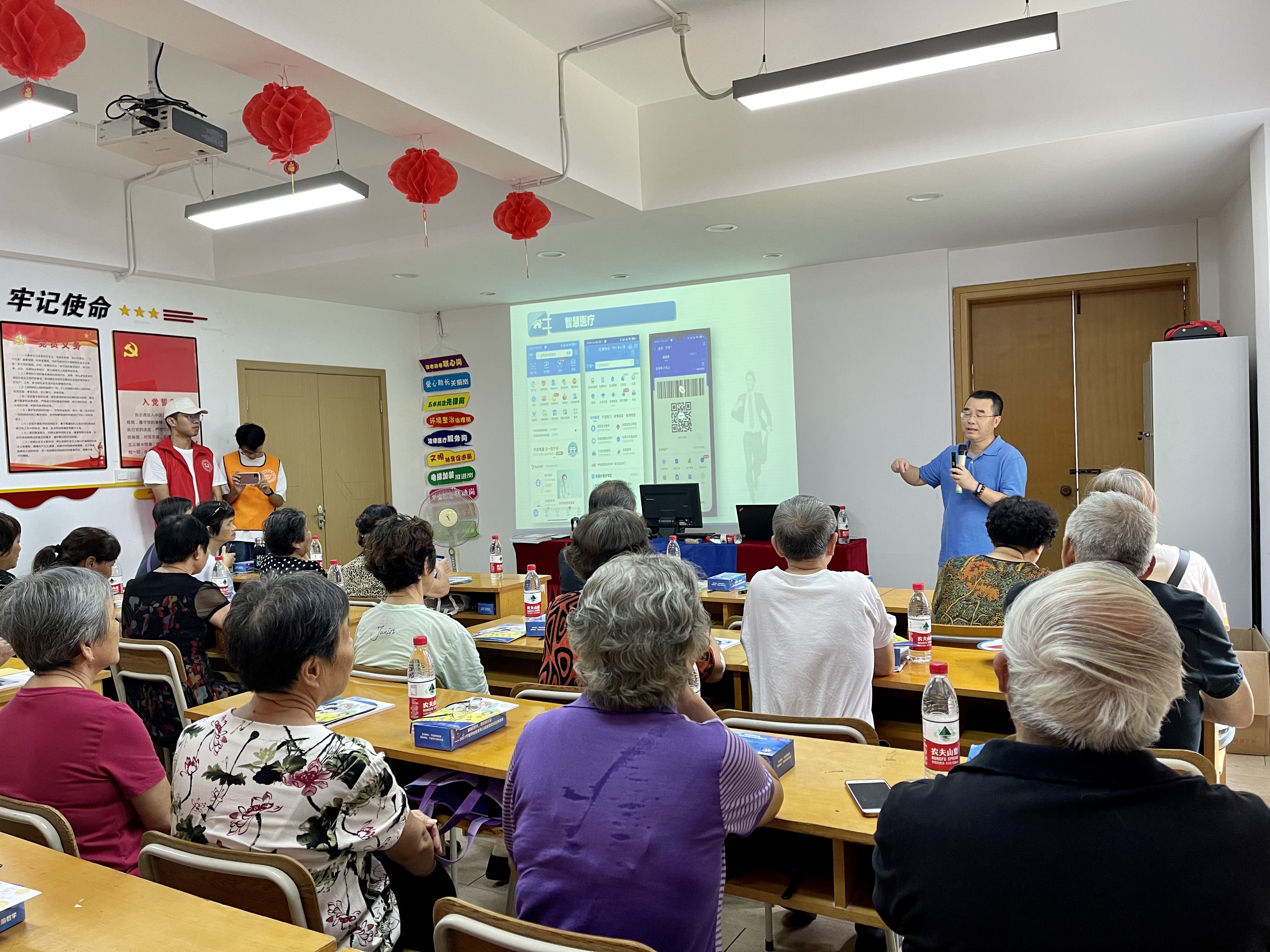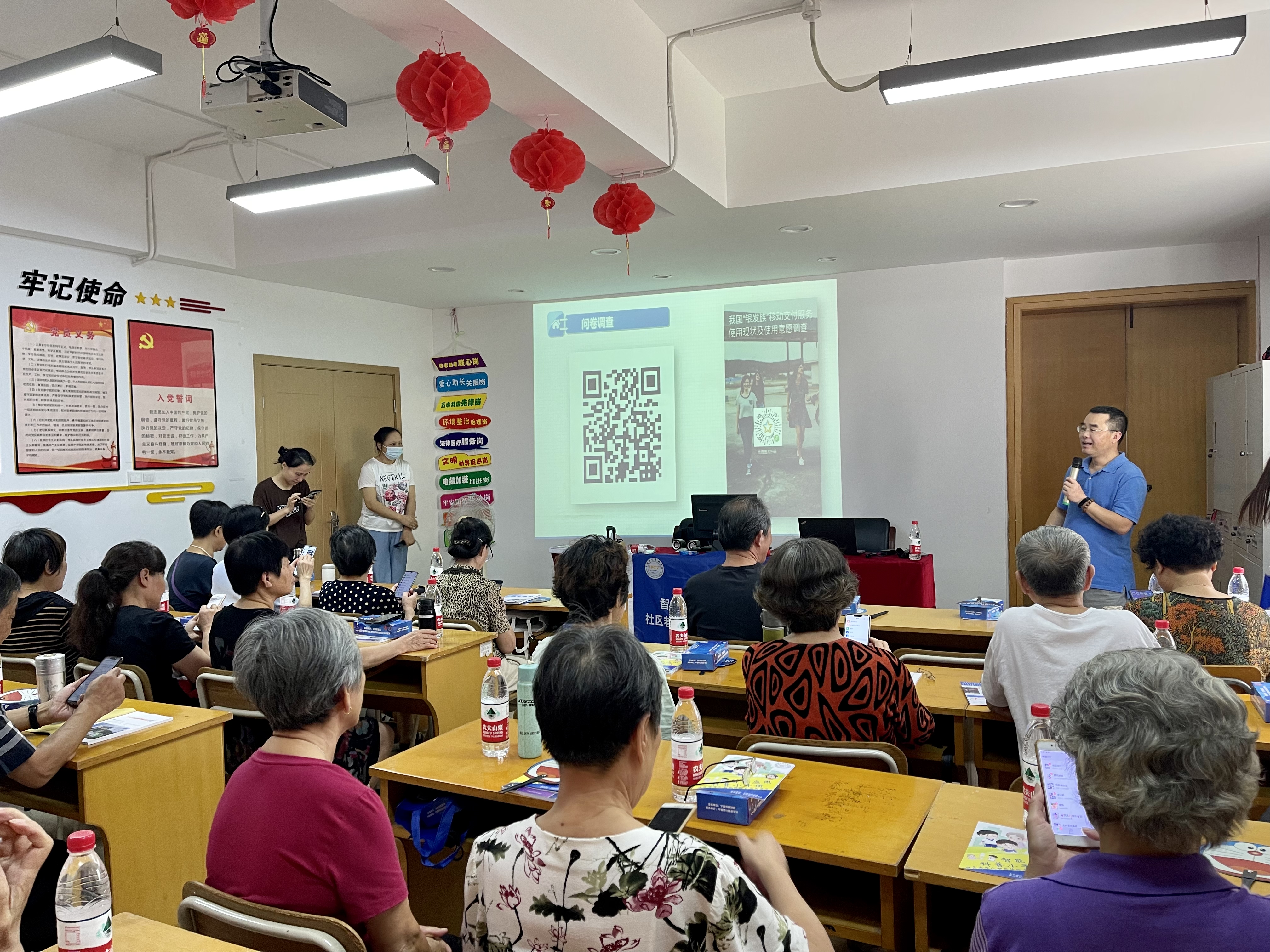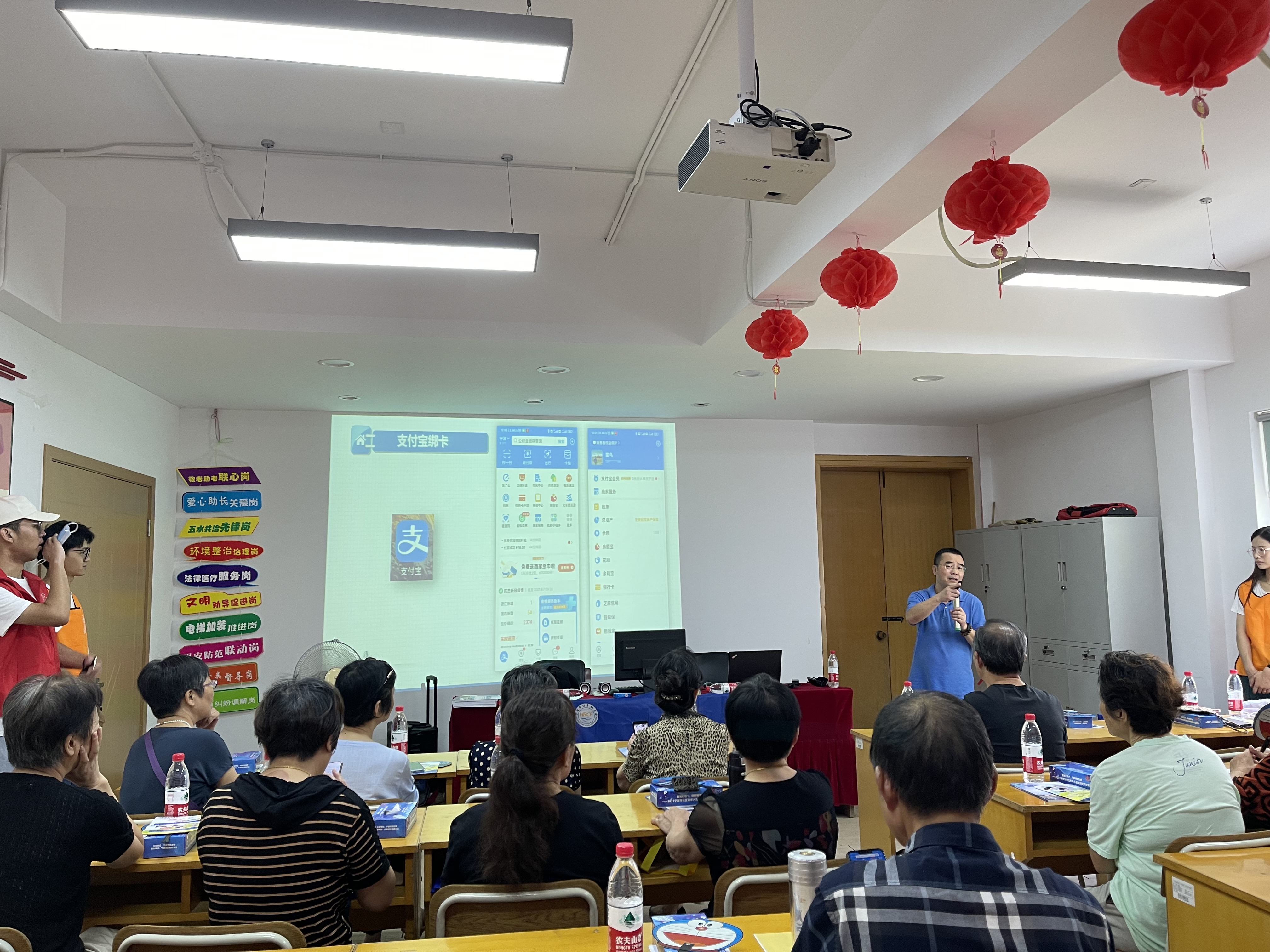今天的社区离叶教授居住的小区很近,叶老师开场就亲切地从日常琐事出发,同在场的老人们套近乎,消除距离感,做完自我介绍让老人们了解自己后,他从支付宝、微信的使用、银行卡绑定开始给在场老人们进行科普,再到智慧医疗、智能出行、线上购物等方面进一步地普及,如何更便捷就医、如何方便出行、如何在线买菜等等。为了便于老人们更好的理解,叶老师放慢节奏,确认在场的老人们都理解了这一部分再继续进入下一部分,保证课程的内容科普到位。