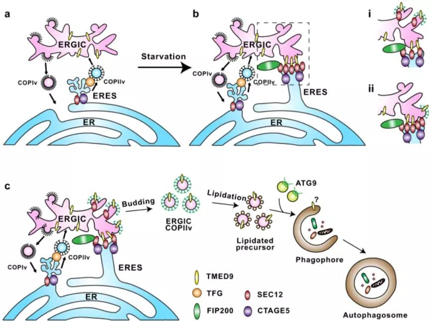 自噬的一个核心步骤是双膜自噬体的形成。该过程需要内膜系统的膜和脂质贡献。尽管在过去几十年中已经努力揭示自噬体的膜来源,但仍然缺乏关于哪个内膜室产生自噬膜的明确答案,特别是关于什么将隔室指定为自噬体的膜源。 最近,ER-高尔基中间隔室 (ERGIC) 作为响应不同自噬刺激的自噬体生物发生的关键膜源。然而,ERGIC 的哪些分子成分决定了其对自噬体生物发生的贡献尚不清楚。