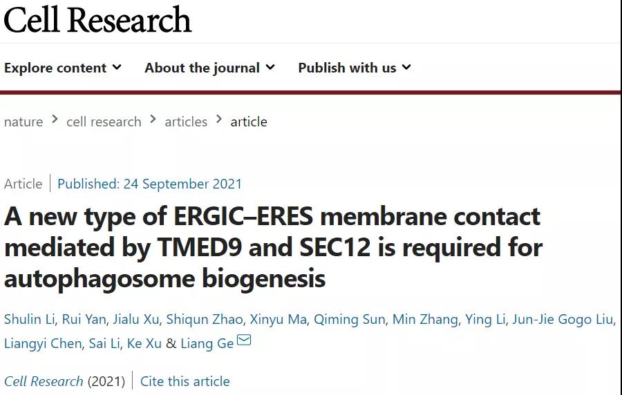 2021年9月24日,清华大学葛亮团队在Cell Research 在线发表题为“A new type of ERGIC–ERES membrane contact mediated by TMED9 and SEC12 is required for autophagosome biogenesis”的研究论文,该研究确定了在 ER-高尔基体系统中的 ER-高尔基体中间区室 (ERGIC) 和 ER 出口位点 (ERES) 之间形成的新型膜接触,这对于促进由不同胁迫刺激诱导的自噬体生物发生至关重要。
