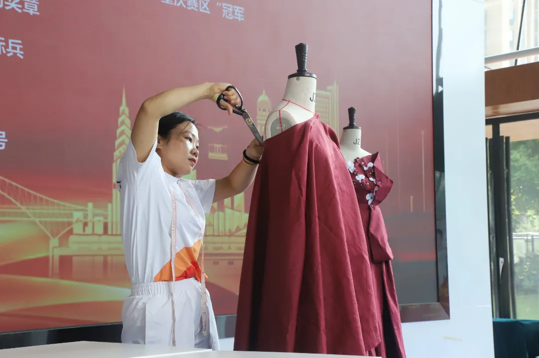 ▲全国技术能手谢玲莉现场制作服装。夏澜 摄