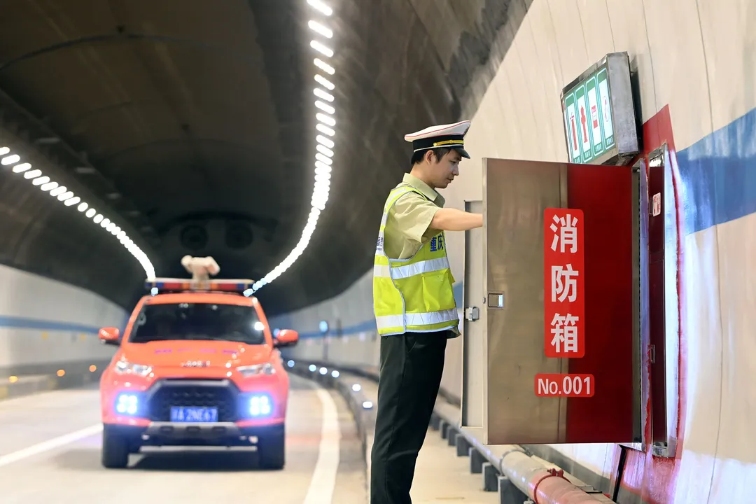 ▲执法人员在通车前检查隧道内消防设施。雷键 摄