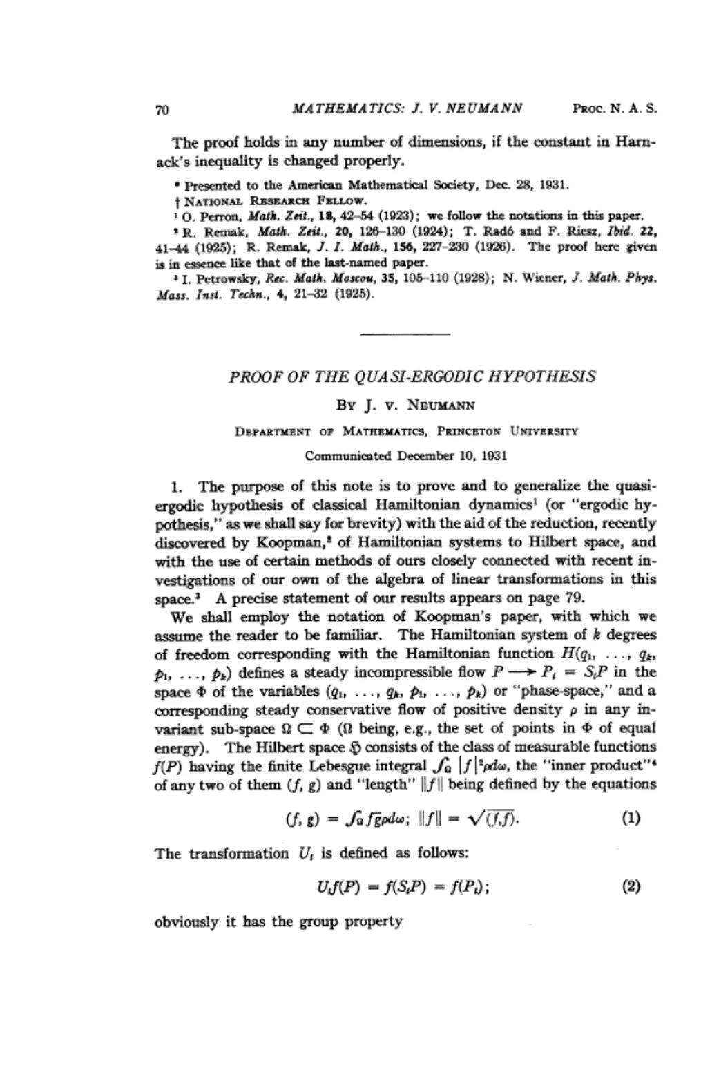 《准遍历假设的证明》论文 图片来源:von Neumann, J. (1932). Proof of the Quasi-ergodic Hypothesis. Proceedings of the National Academy of Sciences 18 (1) pp. 70–82