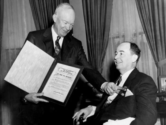 1956年,艾森豪威尔总统(左)授予约翰·冯·诺伊曼总统自由勋章
