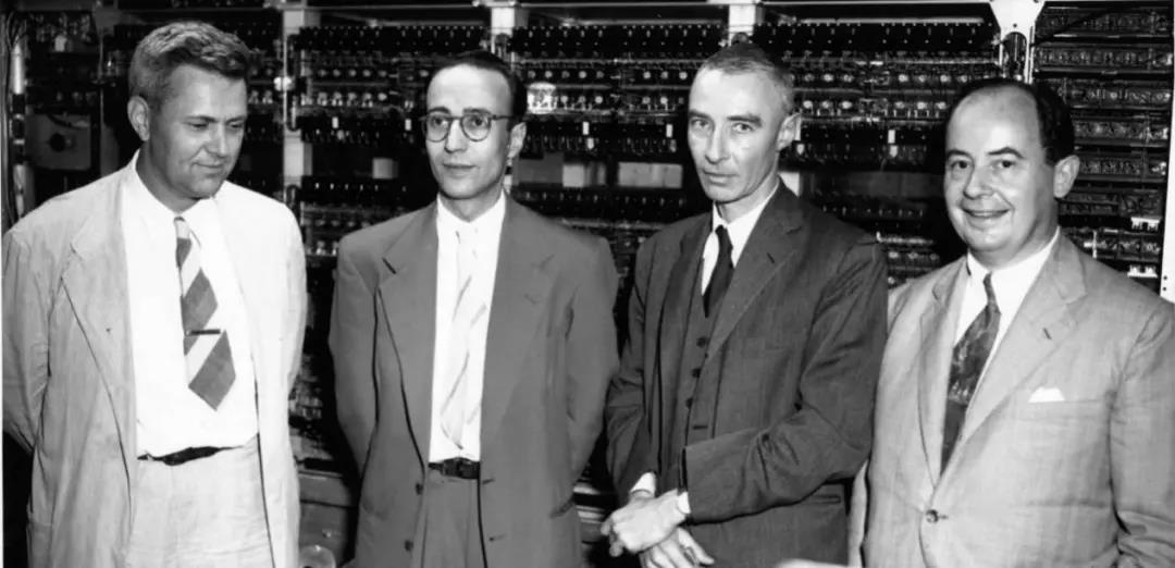 在高等研究院计算机MANIAC前,左起:比奇洛(Julian Bigelow)、戈德斯汀(Herman Goldstine)、 奥本海默和冯·诺伊曼。
