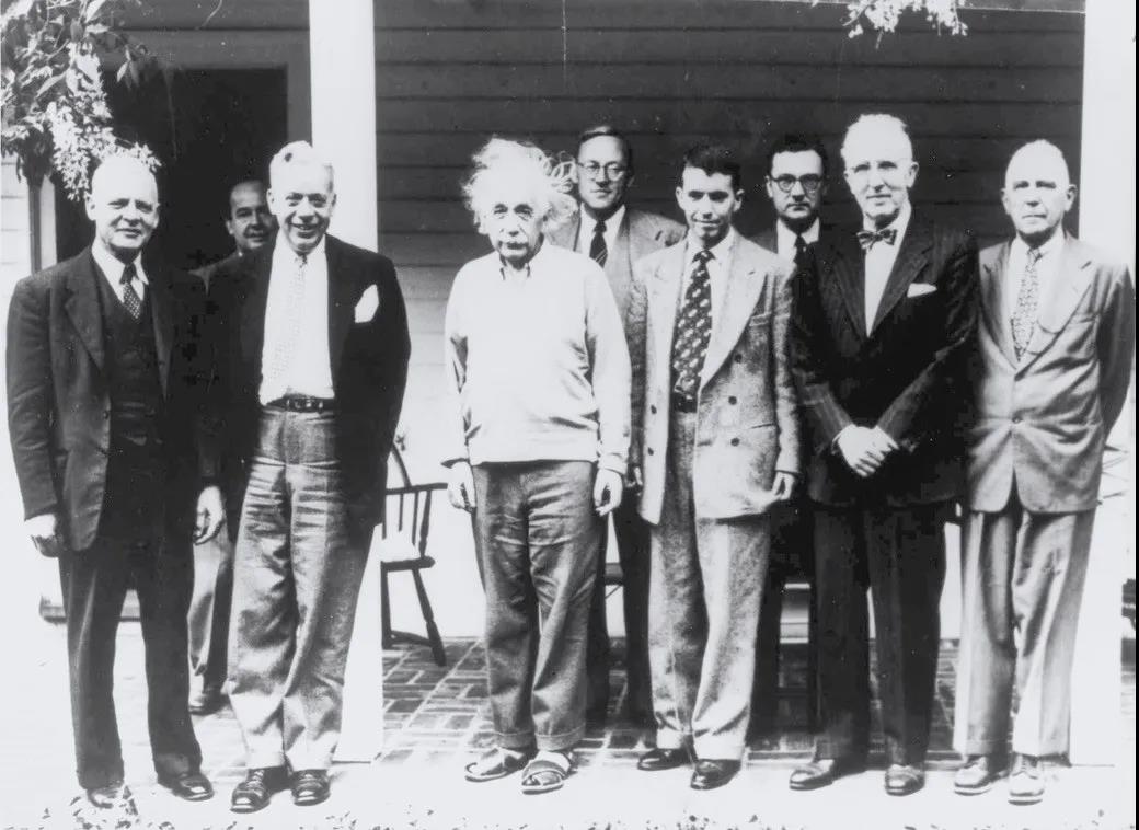 高等研究院的部分职员,照片拍摄于1940年代末,前排左起:Dana Munro,Whitney Oates,爱因斯坦、Mario Laserna Pinzón、马斯顿·莫尔斯、莱夫谢茨(Solomon Lefschetz);后排左起:冯·诺伊曼(在背景中可见)、摩根斯特恩、威尔克斯(Samuel Wilks)。