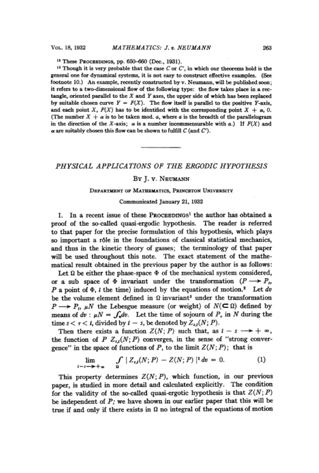 《遍历假设的物理应用》论文 图片来源:von Neumann, J. (1932). Physical Applications of The Ergodic Hypothesis. Proceedings of the National Academy of Sciences 18(3) pp. 263–266.
