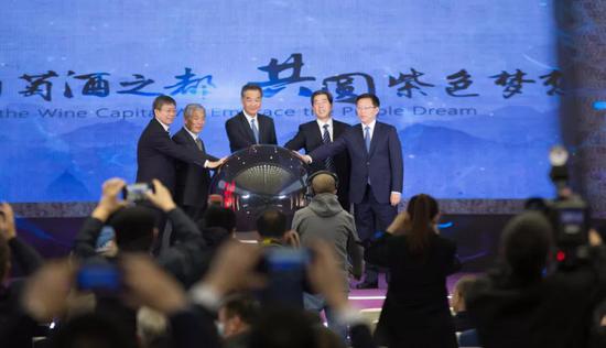全国政协副主席梁振英(中)、宁夏回族自治区党委书记陈润儿(右二)、宁夏回族自治区政协主席崔波(左二)、中央广播电视总台副台长蒋希伟(右一)、农业农村部总经济师魏百刚(左一)共同为第九届贺兰山东麓国际葡萄酒博览会启幕。