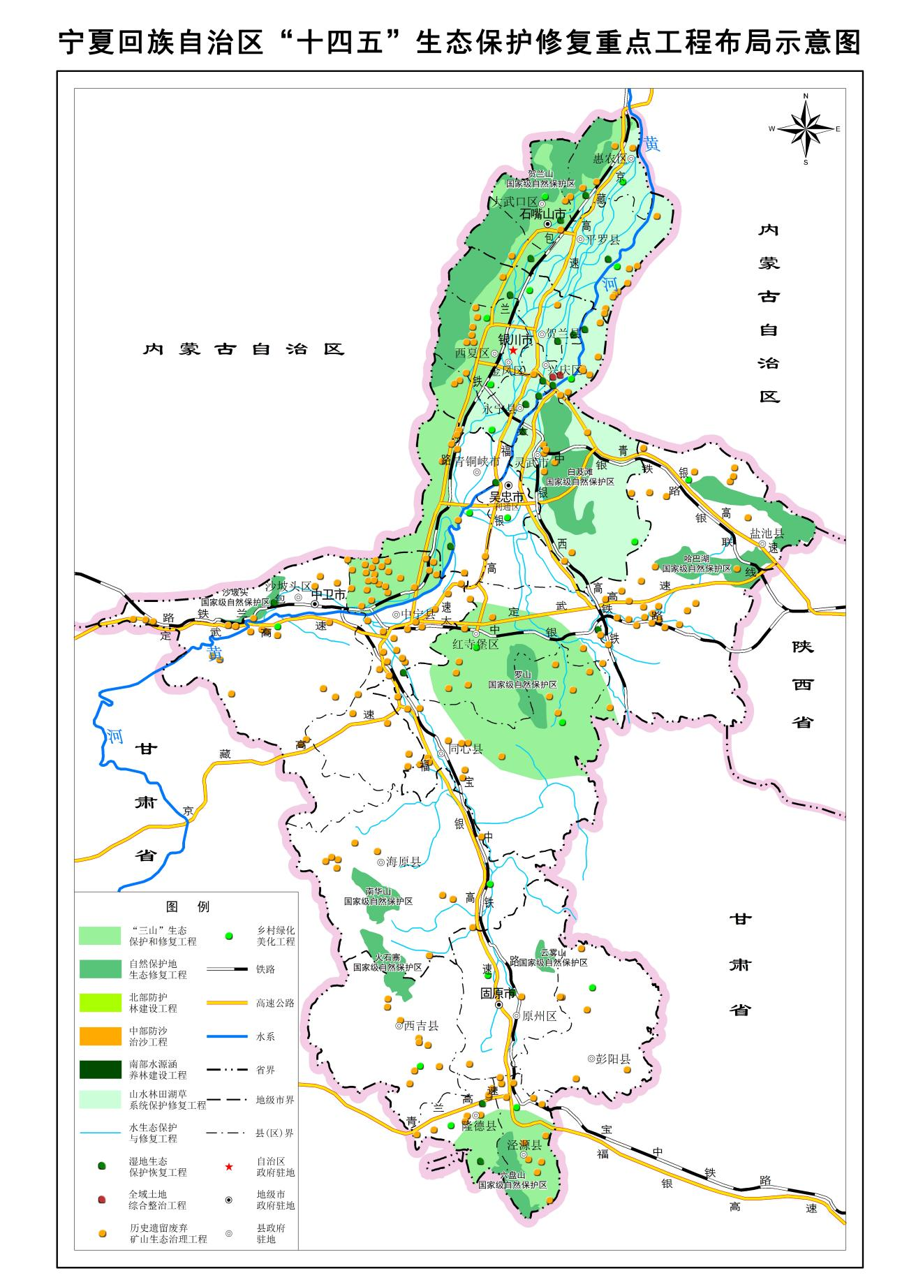 1.“三山”生态保护和修复工程。估算总投资186亿元,实施矿山地质环境及国土综合整治、沟道防洪治理、河湖湿地及水环境综合治理,开展国土绿化、防沙治沙和水土保持,推进贺兰山、罗山、六盘山生态环境保护和修复取得重大进展。2.自然保护地生态修复工程。实施贺兰山、白芨滩、哈巴湖、罗山、沙坡头、南华山、云雾山、火石寨、六盘山9个国家级自然保护区生态保护和修复项目,修复保护面积80万亩,森林质量精准提升20万亩;实施生物多样性保护工程,完善和提升自然保护区管护、科研监测、应急防灾等设施体系。3.北部防护林建设工程。建设沿黄河、沿贺兰山东麓防护体系,实施沿黄地区农田防护林提升改造、骨干水系道路沟渠两侧绿化等,完成人工造林、未成林抚育提升和退化林改造工程。4.中部防沙治沙工程。继续实施封山禁牧工程;以罗山及周边地区为重点,实施扬黄灌区防护林建设、沙化土地综合治理、飞播造林种草等,完成人工造林、未成林抚育提升及退化林改造工程。开展压砂地退化调查,优化种植布局,有序退出压砂种植作物,实施生态保护修复。5.南部水源涵养林建设工程。实施固原市“四个一”林草产业及国家储备林工程,建设六盘山、月亮山及周边地区水源涵养林、库井灌区防护林、重要支流沿线绿化,完成人工造林、未成林抚育提升及退化林分改造。6.水生态保护与修复工程。实施清水河、苦水河、典农河、沙湖等重点河湖生态修复与综合治理工程,坡耕地综合治理、淤地坝建设及除险加固、小流域综合治理等水土保持工程,农村水系综合治理工程。7.湿地生态保护恢复工程。以沿黄湖泊湿地为重点,实施退耕还湿、保护修复、生态效益补偿等,恢复湿地面积36.6万亩,保护修复湿地面积107万亩,新建湿地公园10个。8.山水林田湖草系统保护修复工程。争取国家支持,在贺兰山、六盘山、罗山等重点生态功能区组织实施山水林田湖草沙一体化保护和修复工程。实施洪积扇区生态修复治理、泄洪沟道生态修复治理、入黄沟道两侧盐碱地生态修复治理、乡村环境治理与生态改善、黄河滩地生态保护修复、退化草原生态修复和生态环境监测与管理能力建设等13项工程。9.全域土地综合整治工程。实施兴庆区大新镇、掌政镇全域土地综合整治试点,整体推进农用地整理、建设用地整理和乡村生态保护修复,总结推广试点经验。10.历史遗留废弃矿山生态治理工程。实施贺兰山东麓石嘴山段、银川段、青铜峡段、牛首山,以及盐池县、中宁县、沙坡头区、隆德县、泾源县等历史遗留矿山地质环境恢复治理,开展清理渣土、回填种植土、植被恢复、生态修复等。11.乡村绿化美化工程。按照村庄分类和村庄规划,推进乔灌花草相结合,实施乡村绿化美化25万亩。