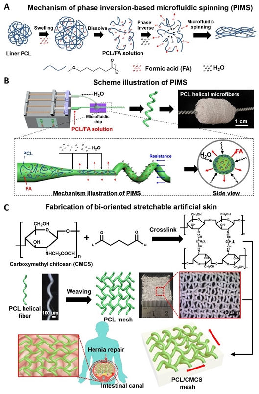 在腹部等大创面的手术中,如何有效避免组织粘连,促进创面愈合,防止切口疝形成?日前,南京工业大学材料化学工程国家重点实验室教授陈苏课题组研发出一种基于双溶剂相转移原理的微流控纺丝新技术,构筑的高强度螺旋纤维编织成的人造皮肤,实验室显示有效解决了这些问题。近日,该研究成果被《德国应用化学》杂志刊发。