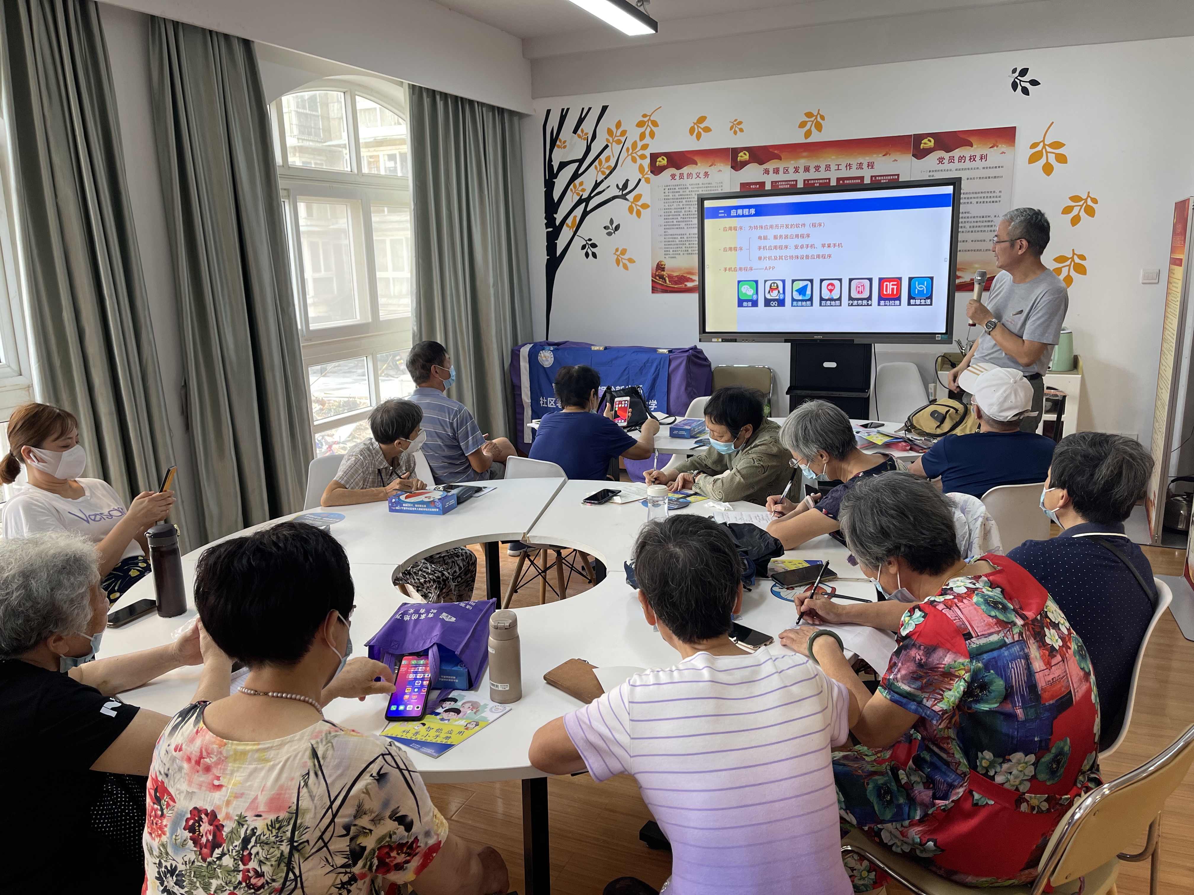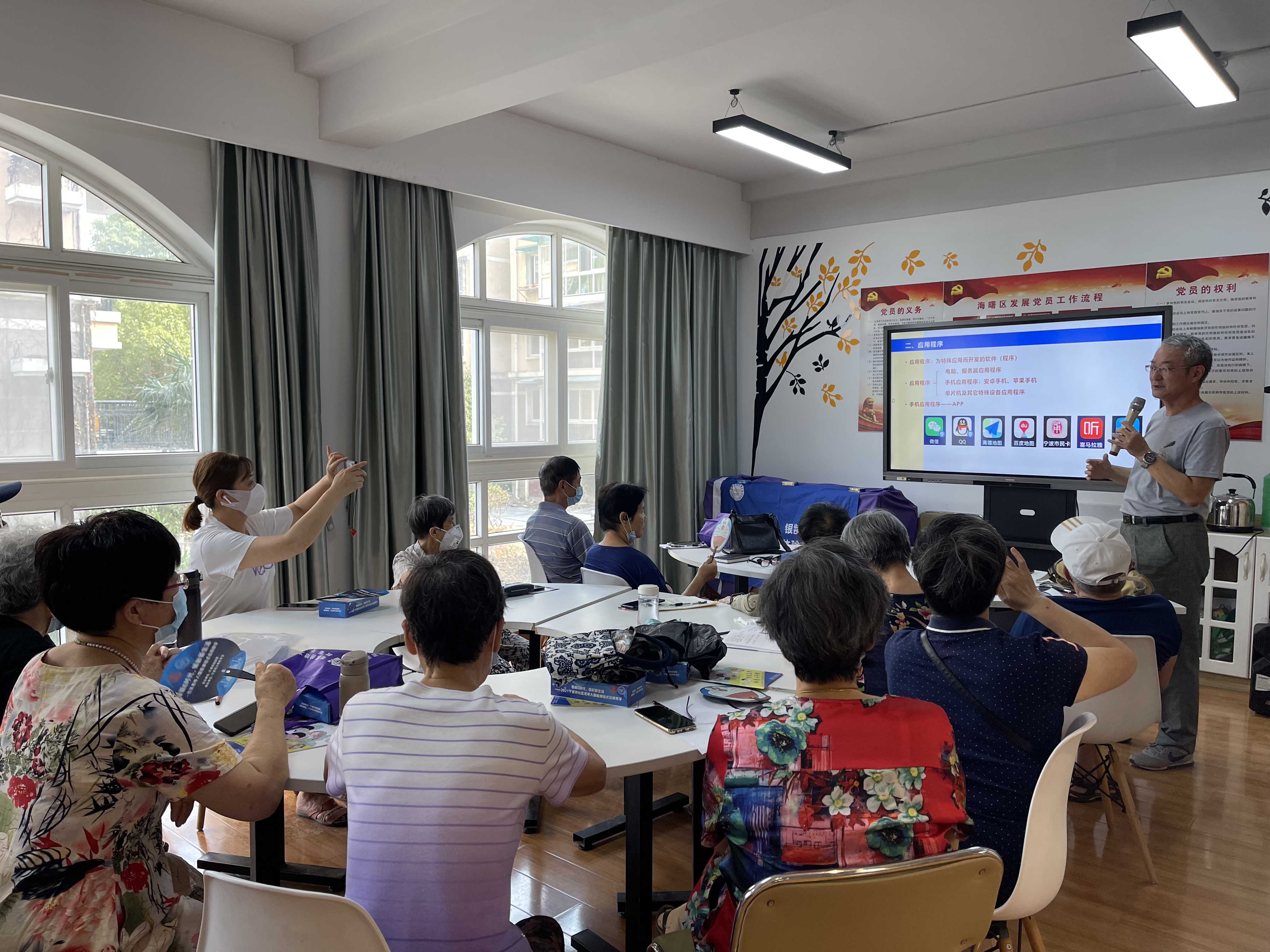 2021年9月28日下午14点30,“智能E时代,银龄新生活——社区老年人智能体验式应用教学”活动,在宁波市海曙区南门街道万安社区顺利开展。近30位老人来到万安社区居委会上课,海曙区教育局教研室教研员李世喜老师为老人们带来了一堂内容丰富的课。