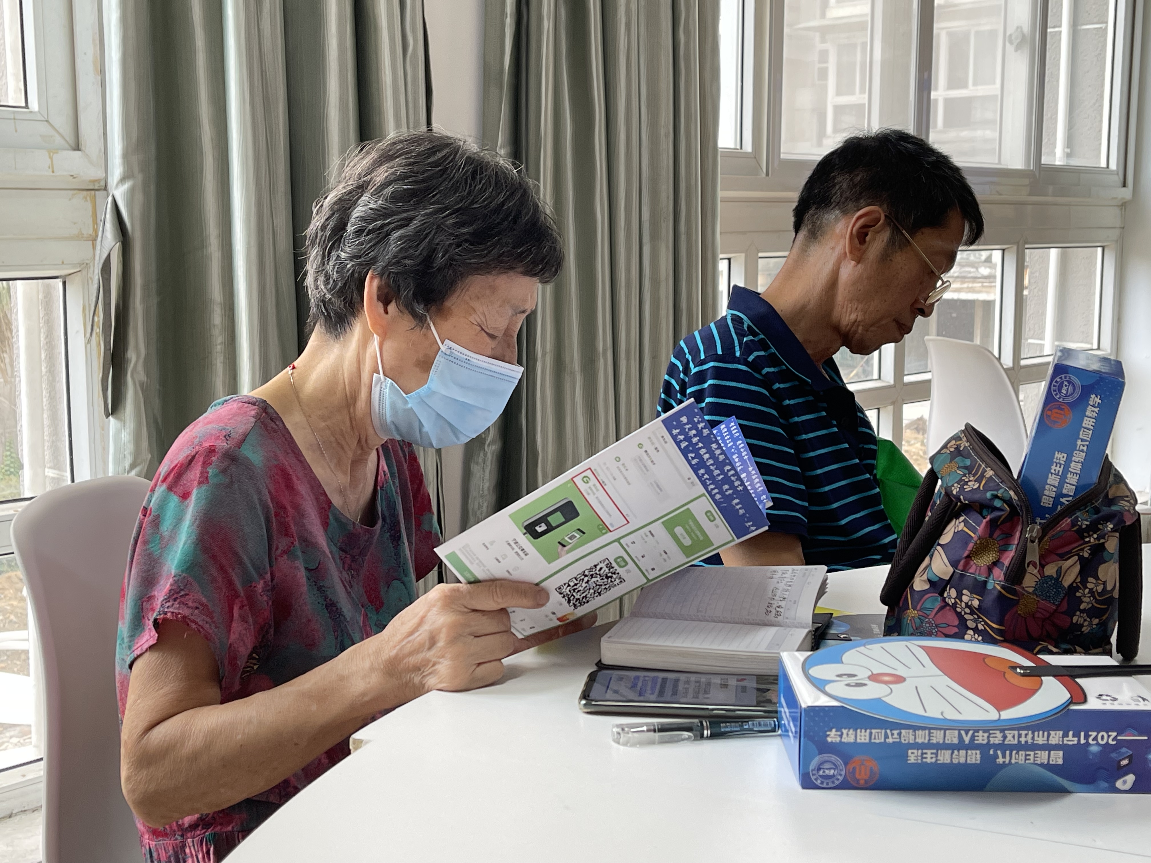 主题团扇、主题纸巾也在加深老年人对课程的印象。还有老人时不时举手提问,对于不是很理解的部分让李老师进行进一步的讲解介绍。有的老人打开科普小手册,学习手册上的操作方法,以便更好地掌握智能手机的使用方法。
