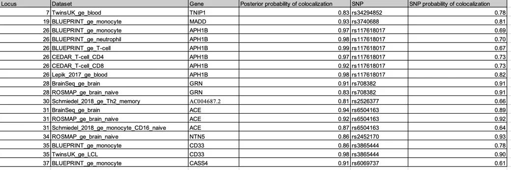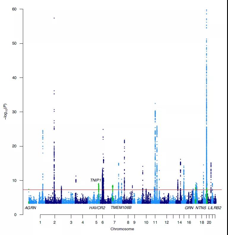他们发现了38个独立位点中的3915个变异。在这38个位点中,有7个未曾被GWAS报道过,其中5个未曾报道过与痴呆症相关(AGRN、TNIP1、HAVCR2、NTN5、LILRB2)。