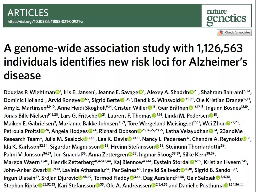 2021年9月7日,阿姆斯特丹自由大学的研究团队在 Nature Genetics 期刊上发表了题为:A genome-wide association study with 1,126,563 individuals identifies new risk loci for Alzheimer's disease 的研究论文。