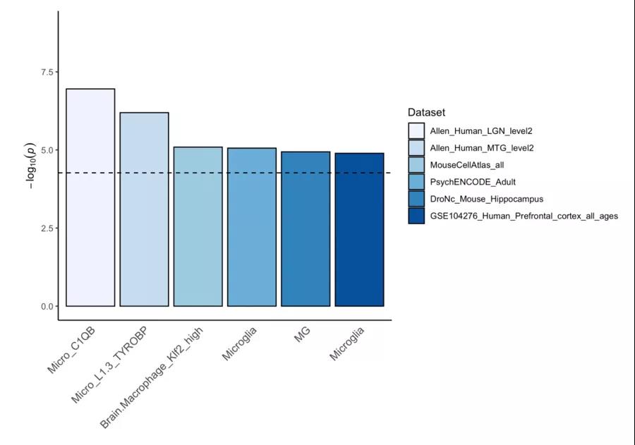 MAGMA组织特异性分析确定了脾脏作为唯一的GTEx组织,而单细胞 RNA 测序数据提示风险基因可能在小胶质细胞中表达。因此,小胶质细胞和免疫组织是识别风险相关基因对阿尔兹海默病发病机制贡献的潜在实验模型。