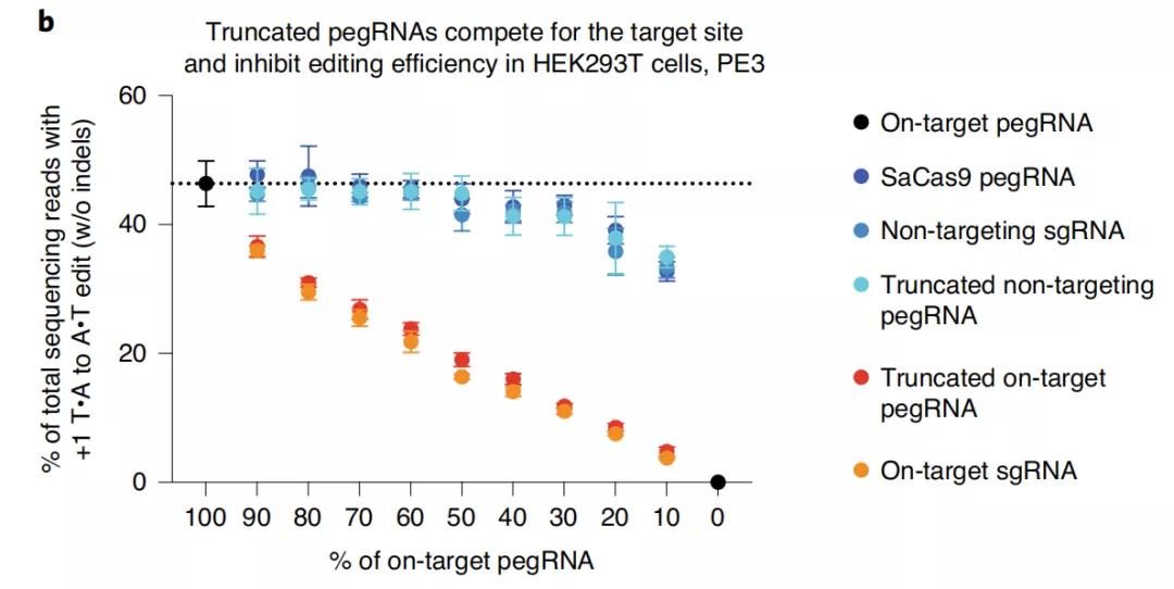 为了验证这一假设,研究小组观察了全长pegRNA和截短的pegRNA在细胞中的差异。pegRNA的3'端区域包含逆转录酶模板和引物结合位点,3'端截短的pegRNA能够竞争目标基因组点,阻止全长pegRNA的结合,从而阻碍PE系统的编辑效率。