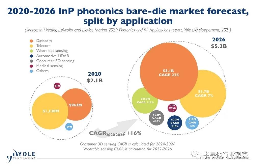 2021年7月底,根据全球权威机构Yole发表的《VCSEL-2021年技术和市场趋势》报告显示,在手机消费、通信设备、汽车工业等多产业的推动下,全球VCSEL市场预计将从2021年的12亿美元增长到2026年的24亿美元,期间复合年增长率为13.6%。