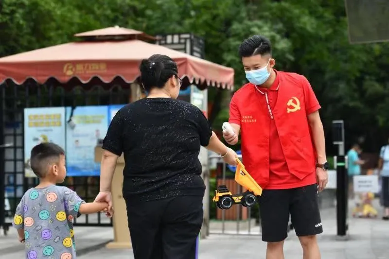 ▲大学城人民小学党员教师雷洪建积极响应,对进出小区及返渝人员进行登记、测量体温。