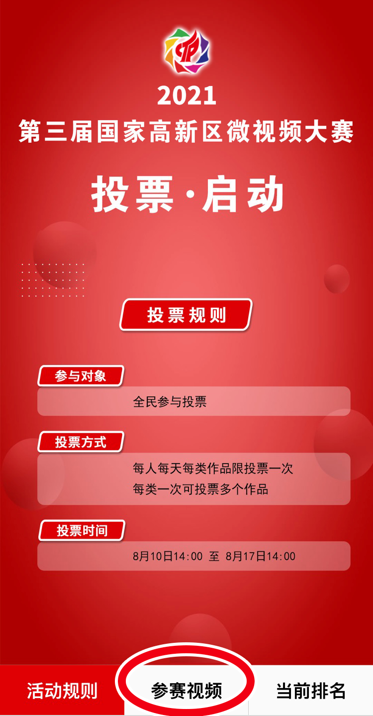大赛投票小程序由“紫睿科技(北京)有限公司”提供技术支持,请放心登录,在搜索框输入地区或视频名称即可找到视频。