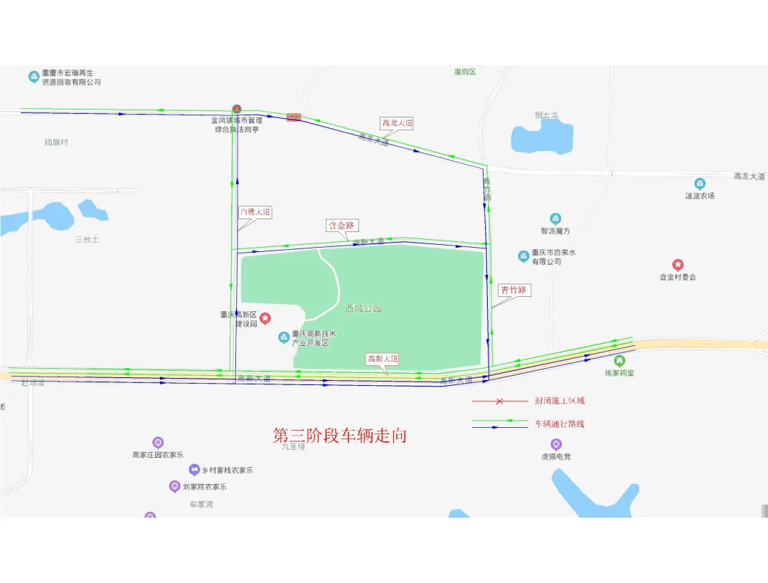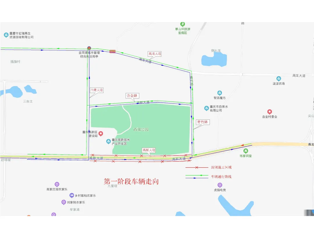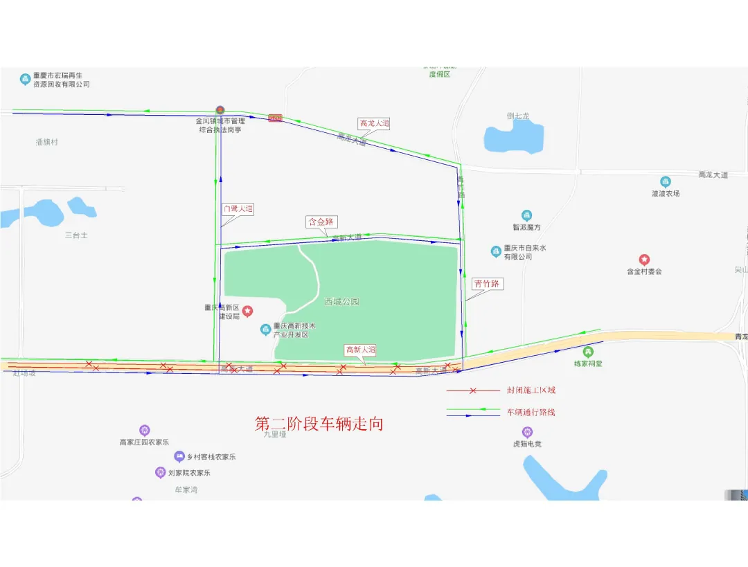 第二阶段——主道施工:改造段主道全封闭,双侧辅道开放通行。为避免交通拥堵,过境社会车辆建议从含金路或高龙大道绕行,前往重庆高新区管委会车辆可通行。预计工期8个月,即2021年11月1日至2022年6月30日。
