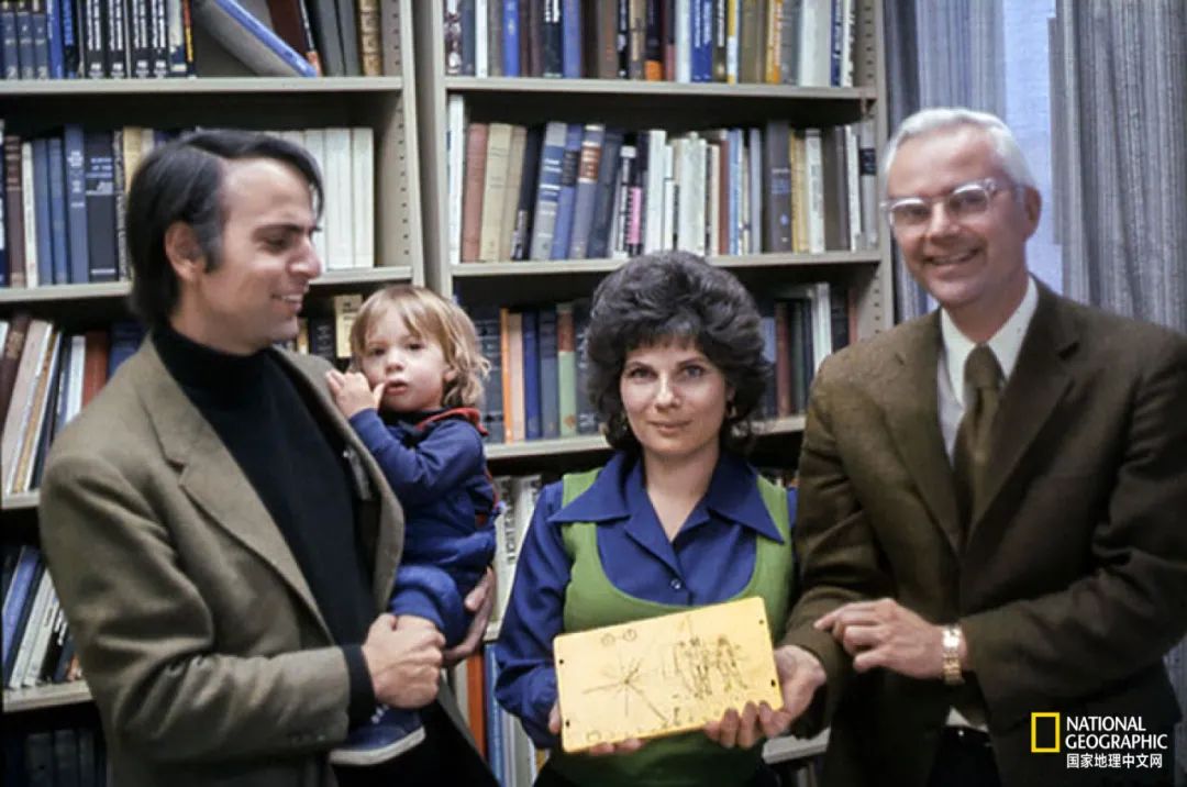 这张照片拍摄于1972年,卡尔·萨根(左, 抱着儿子尼克)、琳达·萨尔兹曼·萨根和弗兰克·德雷克设计了“先驱者10号”和“先驱者11 号” 要送往星际空间的“金唱片”。