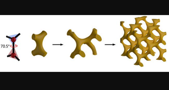 图示:单回转网络的结构单元示意图,从一对顶点开始,这对顶点共享三根支柱中的一根,并被一个“扭曲”角度偏移;中间图像显示了顶点对如何组成一个陀螺体单元,右侧的图像显示了单元如何组装成陀螺体网络。