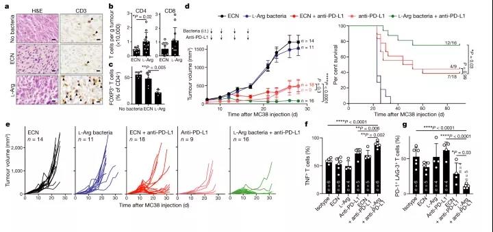 图注:L- Arg 细菌与 PD-L1 阻断协同促进 MC38 肿瘤排斥