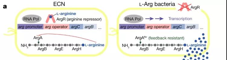 在这项最新的研究中,科研人员对ECN进行了基因改造,删除了精氨酸抑制基因 ( ArgR ),并整合了不受负反馈调节抑制的ArgA fbr突变,构建了一种工程益生菌“L - Arg细菌”,它能特异性地在肿瘤中定植,将肿瘤中积累的代谢废物“氨”转化为L-精氨酸。