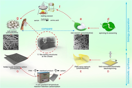 如果能够对这个制备过程和最终结构进行模仿,那么超折叠的结构和性能有可能实现。基于这样的想法,吴庆生和同济大学特聘研究员吴彤领衔的研究团队使用仿生的高分子静电纺丝来模仿家蚕的喷丝作茧过程和类似的网络结构;进一步通过梯度升温原位碳化模仿缫丝过程,不仅同时实现了材料的解交联、造孔和膨化,而且赋予材料导电特性。最终,通过过程和功能的联合仿生技术,实现了导电超折叠材料的制备(见图)。