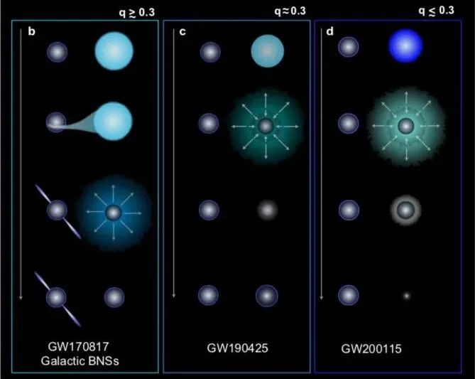 (b)当爆炸能量较高时会形成观测到的双星中子星和GW170817等系统;(c)爆炸能量较低时会形成类似GW190425的系统;(d)爆炸的能量更低时会产生类似GW200115的黑洞-中子星双星。(图片来源:Vigna-Gomez et al.)
