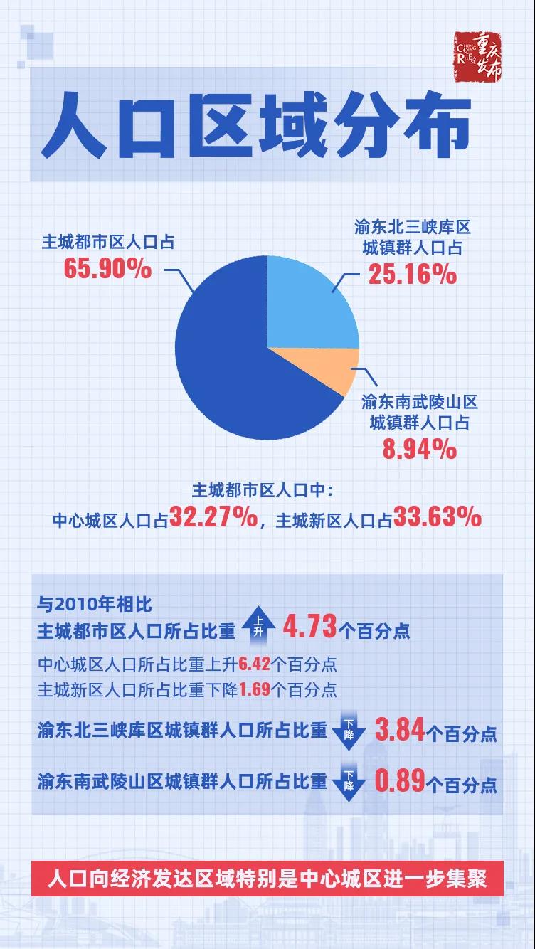 从流向上看,人口持续向经济发展水平相对较高的地区集聚,中心城区的人口增长迅速,特别是渝北区、沙坪坝区、九龙坡区、南岸区、巴南区等中心城区人群集聚度加大,与2010年相比,5区共增加246.40万人。