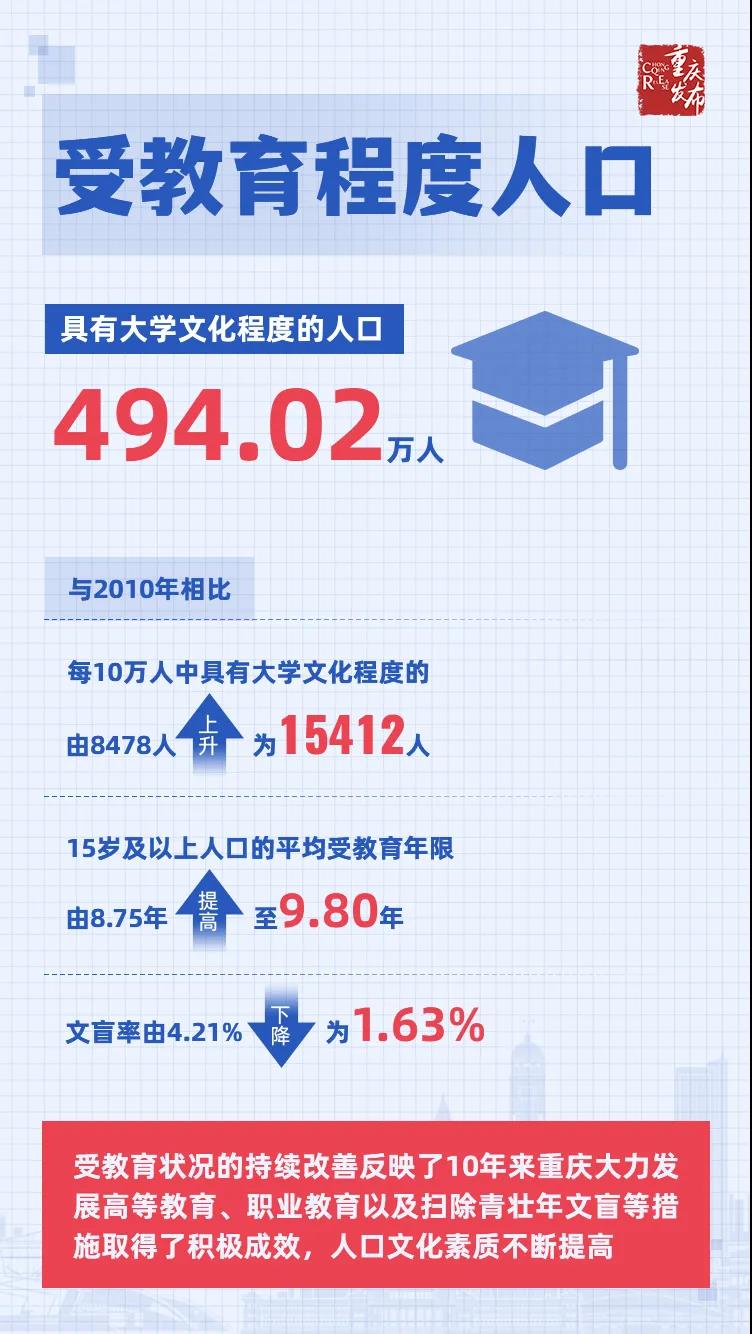 ●人口质量上看,重庆人口文化素质持续提高。15岁及以上人口的平均受教育年限由2010年的8.75年,提升到9.80年;文盲率由4.21%下降到1.63%。