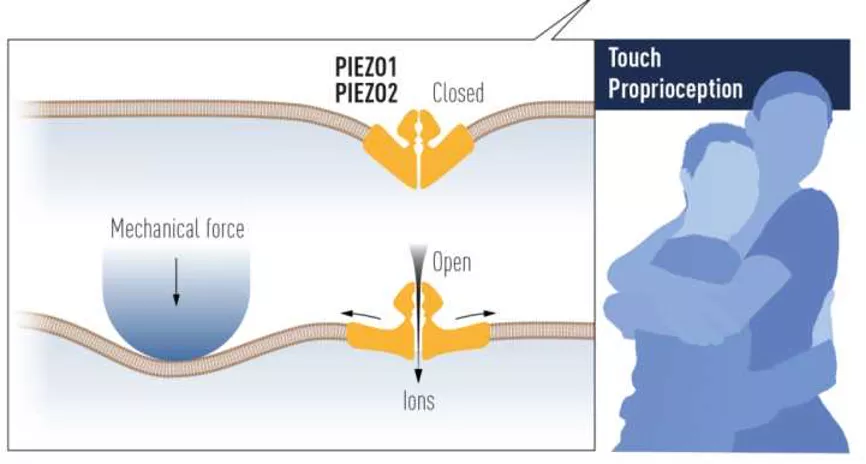 温度/热痛觉是和TRPV1有关,触觉刺痛是和PIEZO2有关,它们都是人体感受器的一部分。