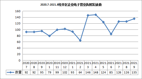 2021年前三季度经开区电子营业执照发放、更新数量合计为2332家,同比增长16.25%,增幅明显。前三季度发放、更新数量分别为755、730、840家,其中电子营业执照发放数量分别为303、357、387家。