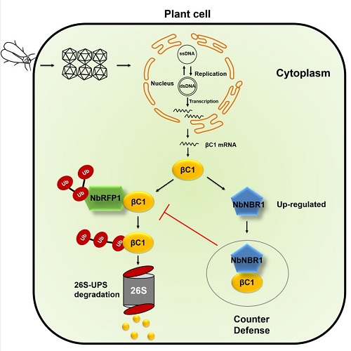 进一步研究发现,NBR1与另一个寄主因子NbRFP1竞争结合βC1。RFP1作为植物泛素化途径中的一个E3泛素连接酶,能够通过泛素化途径降解βC1。