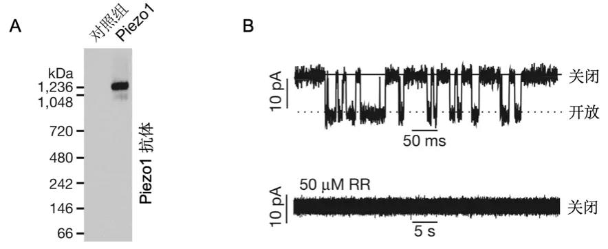 A,纯化的Piezo1蛋白的免疫印迹电泳图(western blot),图中黑色条带即为Piezo1蛋白的条带。B,上图,将纯化后的Piezo1蛋白重组到人工脂质体上后可记录到通道开放事件。下图,该通道开放事件可被广谱阳离子通道阻断剂钌红(RR)所阻断。(图片改编自Coste and Xiao, et al., 2012, Nature[18])