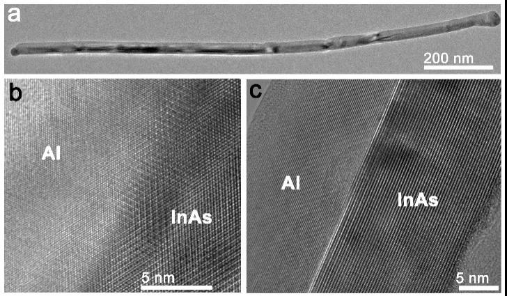 图1:超导/半导体纳米线为国际上实现拓扑量子计算的主要方案,其瓶颈是其对纳米线质量的极高要求。中科院半导体所赵建华课题组最近取得重要进展,已生长出质量为目前国际上最好的纳米线,有望突破瓶颈。图为利用分子束低温原位外延制备的InAs/Al纳米线的微结构。(a):纳米线低倍透射电子显微镜图;(b,c):不同晶带轴纳米线的高分辨透射电子显微镜图,显示异质结界面已经达到原子级平整。