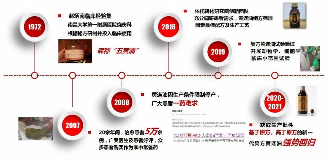 复方黄连油涂剂(俗称“五黄油”)历史悠久,是该院自主研发的首款纯中药制剂。该产品由黄连、黄芩、大黄、黄柏、虎杖、地榆等6味中药制成,最初主要应用于治疗烧烫伤,后逐步拓展至褥疮、糖尿病足、渗出性皮炎、湿疹等慢性创面治疗,累积5万余例次的人用经验,取得良好疗效且未发现毒副作用,受到患者广泛认可。该产品的问世解决了现有用于治疗烧伤、烫伤、慢性创面多采用抗生素等化学药品,治疗效果不佳且易导致抗生素累积的市场痛点。在国家鼓励中医药创新研发的政策背景下,遵循“临床验方-医疗机构制剂-中药新药”的研发路线,该产品有望通过积累人用经验进而完成从制剂到中药创新药的转变。