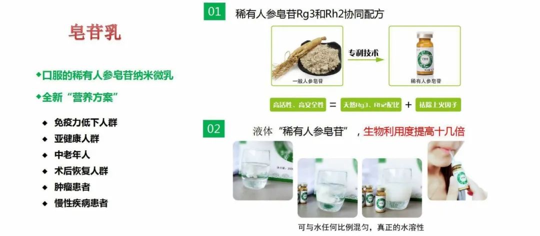 “皂苷乳-亚麻籽油人参饮品”由该院与江西康一参生物科技有限公司合作研发。皂苷乳产品融合红参专利加工技术和自主研发的纳米口服乳制剂技术两大技术体系,创新红参专利技术,将低活性的天然人参皂苷,转化生成富含Rg3组和Rh2组稀有人参皂苷;突破关键技术瓶颈,开发出我国首款食品级稀有人参皂苷纳米口服乳。该产品目前已形成了良好的市场效益,预期还可继续通过制剂技术完成从食品到功能性食品、药品的转变,探索在缓解肿瘤放化疗副作用、改善失眠和术后康复等领域的应用。