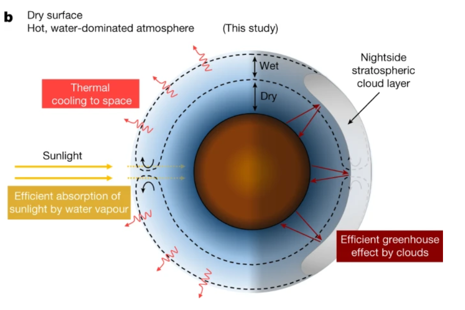 科学家认为,考虑到在45亿年前金星形成后不久就被岩浆覆盖,为了形成海洋,金星的大气温度必须在最初的几千年内降低到能使水蒸气凝结成雨的水平,若想达到这一条件,就需要金星表面形成足够遮挡太阳辐射的云层。在本研究中,研究者建立了早期金星和地球的三维全球气候模型,相比过去的一维数值气候模型来说,新的模型考虑了大气环流和云层的影响。模型显示,云层会优先形成于金星处在夜晚的那半球,这一侧的云层无法降低太阳辐射,反而会通过温室效应,将热量困在金星的大气层中,从而维持金星表面较高的温度。因此,金星难以产生降雨,继而不太可能出现海洋。
