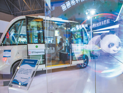 第三届西洽会上展示的全息智能炫屏、无人驾驶迷你巴士。邹 乐摄
