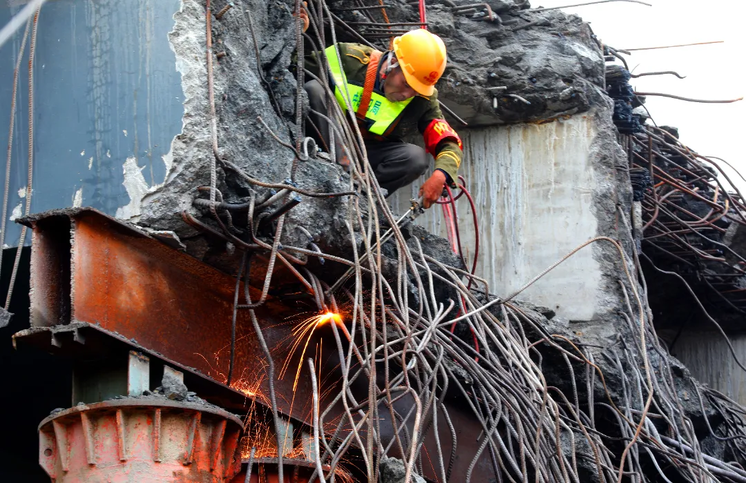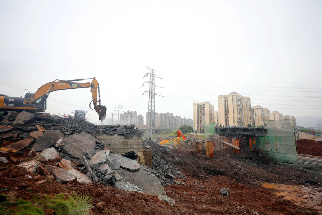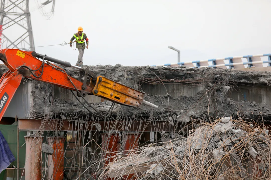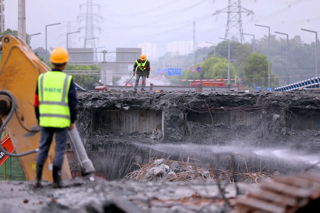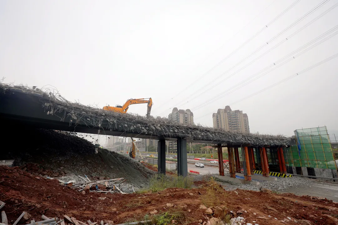 ▲工人正在拆除跨线桥。雷键 摄