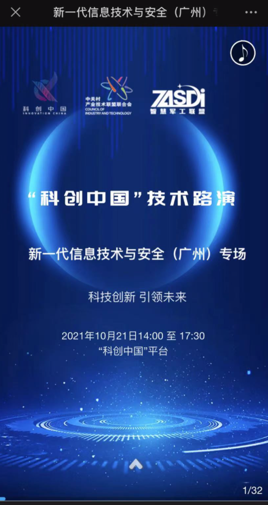“科创中国”技术路演一一新一代信息技术与安全(广州)专场由中国科学技术协会主办,中国科协企业创新服务中心、广州市科学技术协会、中关村产业技术联盟联合会、中关村科创智慧军工产业技术创新战略联盟共同承办。