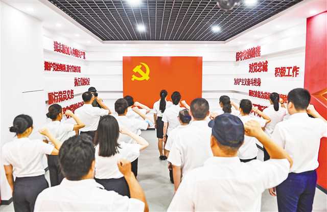 6月24日,红岩村景区,讲解员们在党旗下宣誓,重温入党誓词。