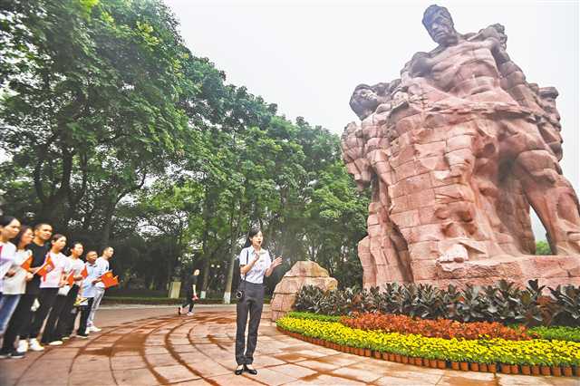 6月28日,烈士陵园,讲解员李鑫正在群雕下讲解革命先辈的英雄事迹。