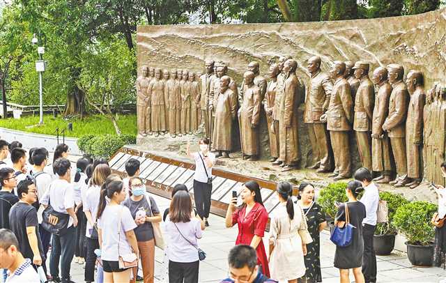 7月7日,红岩村景区,讲解员张丽佳正在为市民讲解革命故事。