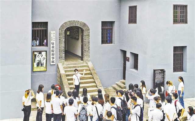6月25日,红岩村景区中共中央南方局暨八路军重庆办事处旧址,讲解员蔡馨正在为市民讲革命故事。