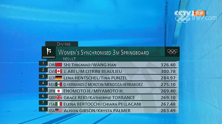 作为女子双人三米板的头号种子,在女子双人三米板开始之前,不少观众就认为,施廷懋与王涵将轻松获得该项目的冠军。虽然被广泛看好,但施廷懋、王涵的金牌之路却没有想象中那么容易。在当天下午举行的女子双人三米板比赛中,第五个登场的施廷懋、王涵在前两跳发挥了正常水平,获得了99.6分的成绩。但让人没想到的是,来自美国的选手吉布森和帕米尔在第二跳就跳出了50.4分的高分,在前两轮与施廷懋、王涵平分。