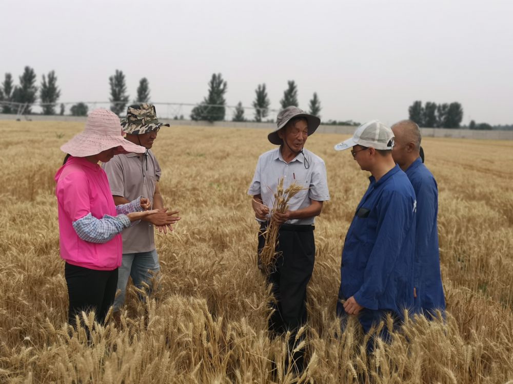 2019年6月13日,郭进考(左三)与农场技术人员在麦田里查看小麦长势。(马兰农场供图)