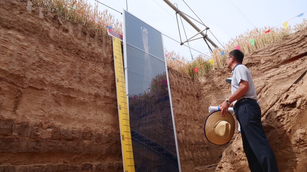 2019年夏收时节,记者在马兰农场节水小麦示范田看到,田里挖出一个近3米的大坑,参观者可直观看到节水小麦扎入土层达2.5米的强韧根系。这块示范田的小麦,播种后一水未浇,只靠雨养天收,亩产达430.6公斤,浇一水亩产过千斤。